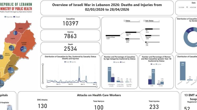 صدر عن مركز عمليات طوارئ الصحة التابع لوزارة الصحة العامة بيان أعلن أن الحصيلة التراكمية الاجمالية للعدوان منذ 2 آذار حتى 28 نيسان باتت كالتالي: 2534 شهيدا و 7863 جريحا.