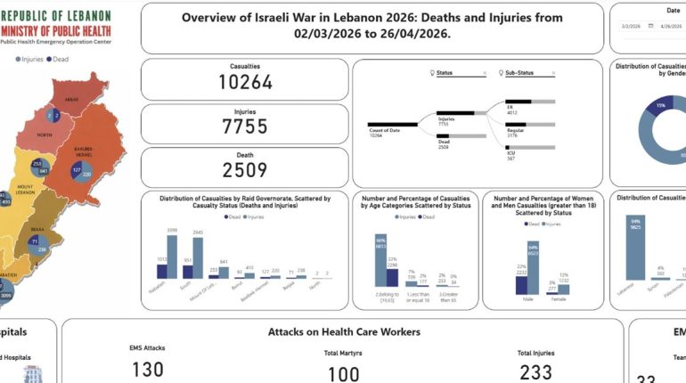 صدر عن مركز عمليات طوارئ الصحة التابع لوزارة الصحة العامة بيان أعلن أن الحصيلة التراكمية الاجمالية للعدوان الإسرائيليّ منذ 2 آذار حتى 26 نيسان باتت كالتالي: 2509 شهداء و7755 جريحا.