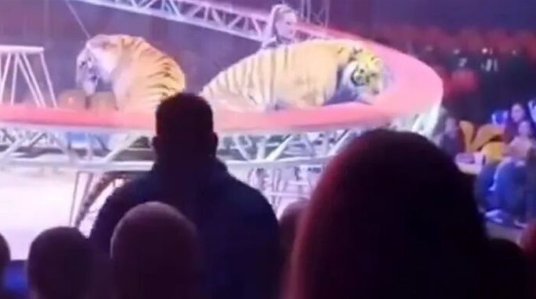 فيديو: لحظات رعب في سيرك روسي…نمر يقتحم الجمهور